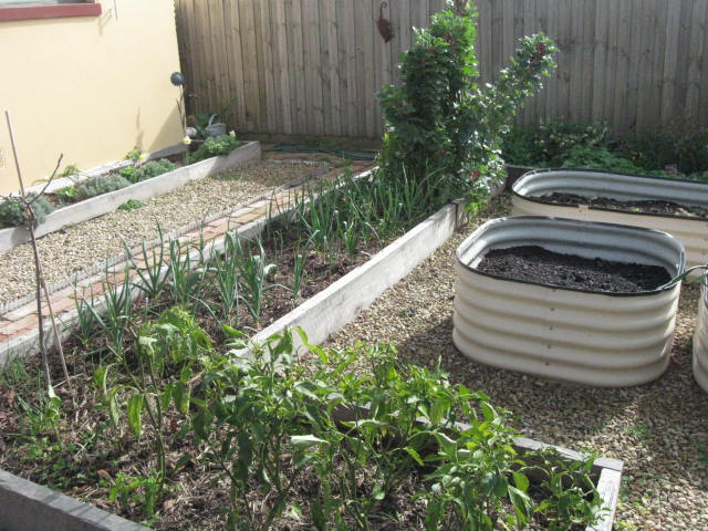 As winter draws to a close, I thought it was time to update on the front veggie garden. The 2 empty raised beds have or will have potatoes in them this week. There are freshly pruned capsicum and chilli plants (they were still covered in red fruit until the weekend, but they were a bit soft and past it). A nice row of garlic coming along well. Broad beans on the teepee, with lots of baby broad beans on them. Lettuce, perpetual spinach, mizuna and parsley. A few leeks are left, but most have been enjoyed in soups and risotto. It must be time to start planning and planting for spring!